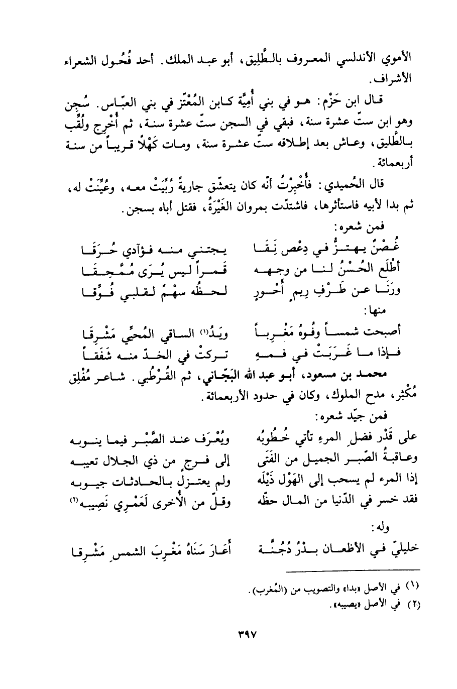 الْأمويّ الْأندلسي المعروف بالطَّلِيق، أَبُو عَبْد الملك. أحد فُحُول الشعراء الْأشراف.