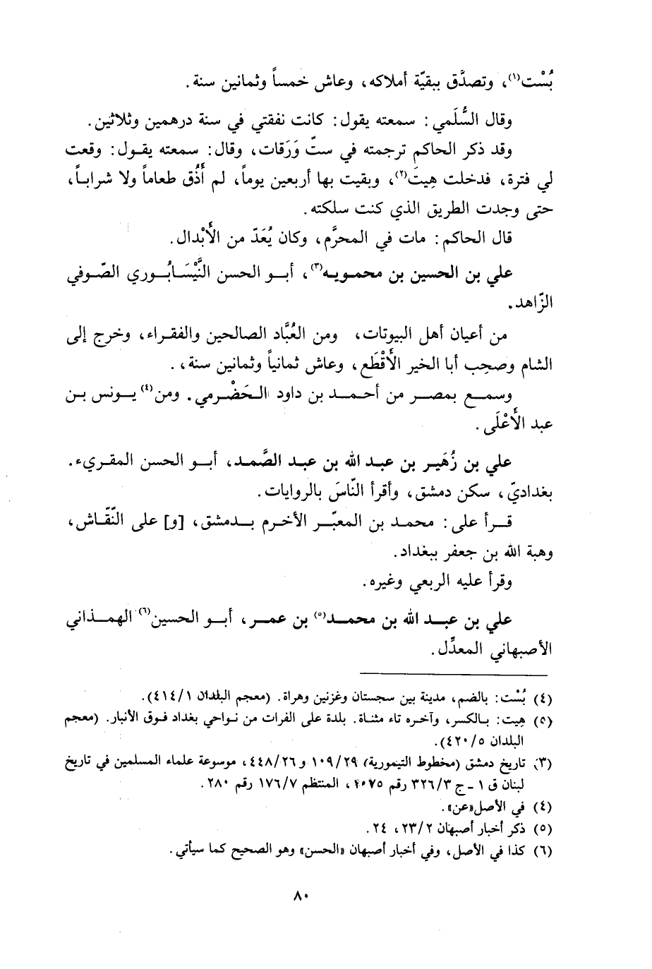 [3] تاريخ دمشق (مخطوط التيمورية) 29/ 109 و 26/ 448، موسوعة علماء المسلمين في تاريخ لبنان ق 1- ج 3/ 326 رقم 1075، المنتظم 7/ 176 رقم 280.