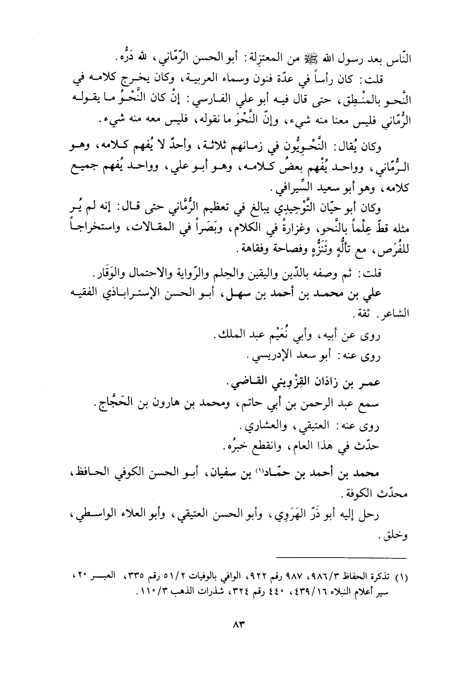 قلت: كَانَ رأسًا فِي عدّة فنون وسماء العربية، وكان يخرج كلامه في النّحو بالمنطق، حتى قال فيه أبو علي الفارسيّ: إن كان النّحو ما يقوله الرّمّاني فليس معناه منه شيء، وإن النَّحْو ما نقوله، فليس معه منه شيء.