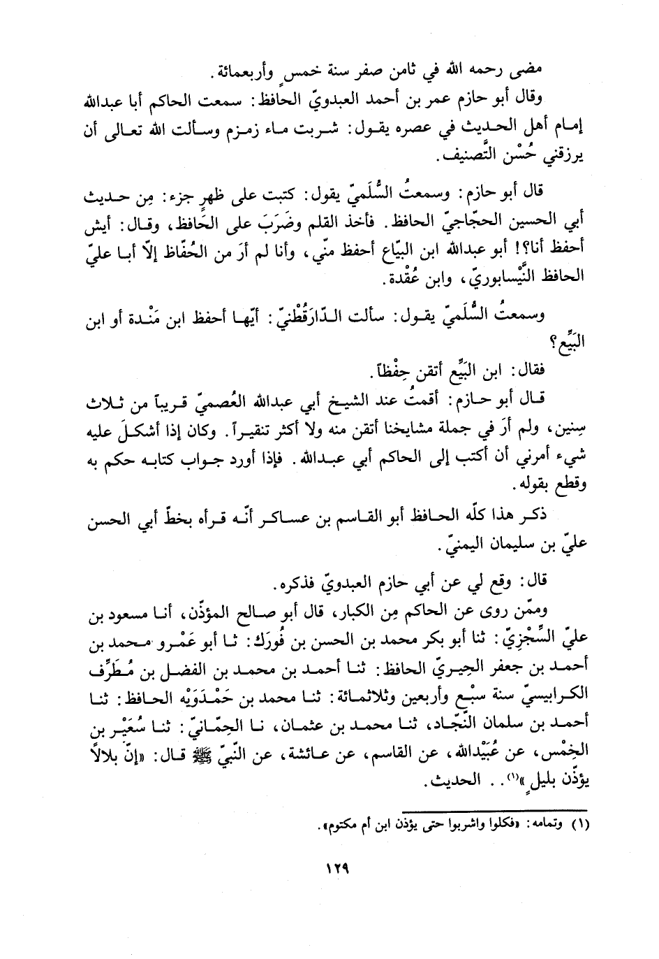 وَمِمِّنْ رَوَى عَنِ الْحَاكِمِ مِنَ الْكِبَارِ، قَالَ أَبُو صَالِحٍ الْمُؤَذِّنُ، أنا مَسْعُودُ بْنُ عَلِيٍّ السِّجْزِيُّ: ثنا أَبُو بَكْرٍ مُحَمَّدُ بْنُ الْحَسَنِ بْنِ فُورَكٍ: ثنا أَبُو عَمْرٍو مُحَمَّدُ بْنُ أَحْمَدَ بْنِ جَعْفَرٍ الْحِيرِيُّ الْحَافِظُ: ثنا أَحْمَدُ بْنُ مُحَمَّدِ بْنِ الْفَضْلِ بْنِ مطرّف الكرابيسيّ سنة سبع وأربعين وثلاثمائة: ثنا مُحَمَّدُ بْنُ حَمْدَوَيْهِ الْحَافِظُ: ثنا أَحْمَدُ بْنُ سَلْمَانَ النَّجَّادُ، ثنا مُحَمَّدُ بْنُ عُثْمَانَ، نا الْحِمَّانِيُّ: ثنا سُعَيْرُ بْنُ الْخِمْسِ، عَنْ عُبَيْدِ اللَّهِ، عَنِ الْقَاسِمِ، عَنْ عَائِشَةَ، عَنِ النَّبِيِّ صَلَّى اللَّهُ عَلَيْهِ وَسَلَّمَ قَالَ: «إِنَّ بلالا يؤذّن بليل» [1] .. الحديث.