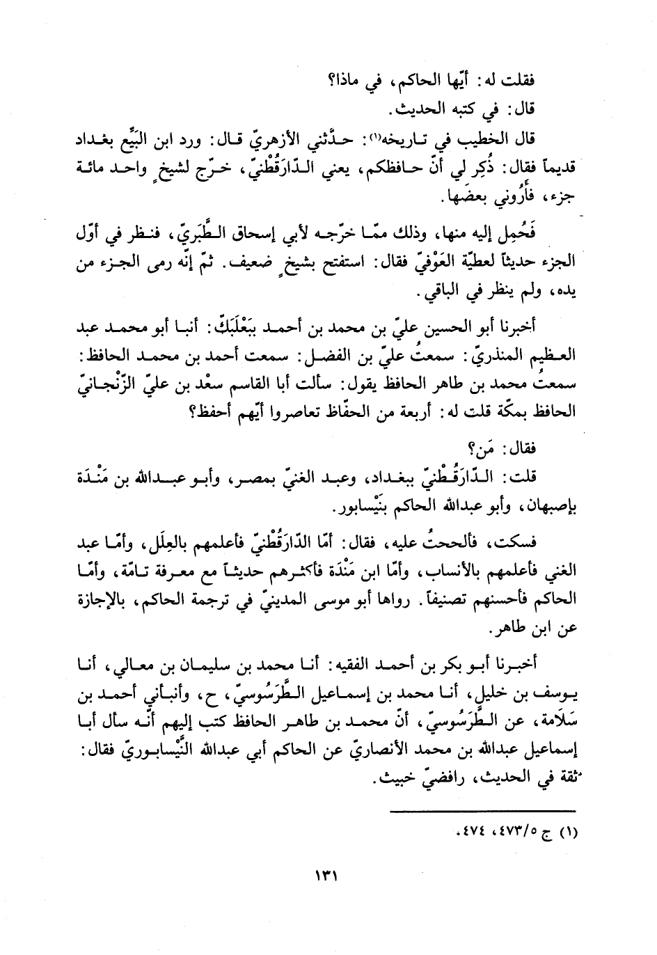 فسكت، فألححتُ عَليْهِ، فقال: أمّا الدّارَقُطْنيّ فأعلمهم بالعِلَل، وأمّا عَبْد الغني فأعلمهم بالأنساب، وأمّا ابن مَنْدَهْ فأكثرهم حديثًا مَعَ معرفة تامّة، وأمّا الحاكم فأحسنهم تصنيفًا. رواها أبو موسى المدينيّ في ترجمة الحاكم، بالإجازة عَنِ ابن طاهر.