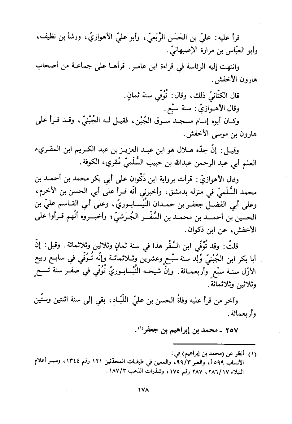 قلتُ: وقد تُوُفّي ابن السَّفْر هذا في سنة ثمانٍ وثلاثين وثلاثمائة. وقيل: إنّ أبا بكر ابن الجبنّيّ ولد سنة سبع وعشرين وثلاثمائة وإنّه تُوُفّي في سابع ربيع الأوّل سنة سبع وأربعمائة. وإنّ شيخه النَّيْسابوريّ تُوُفّي في صفر سنة تسع وثلاثين وثلاثمائة.