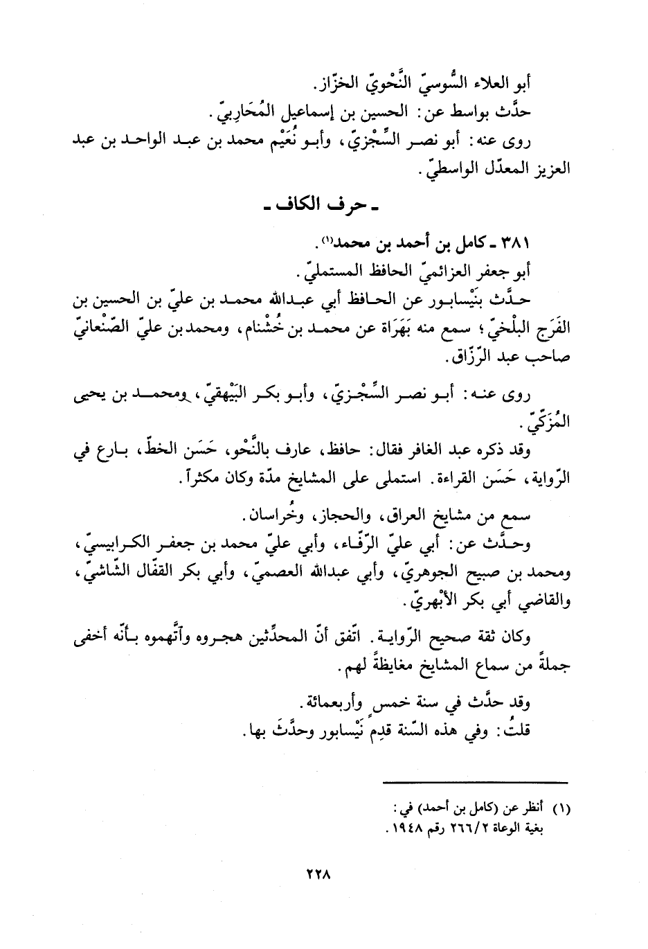 وقد ذكره عبد الغافر فقال: حافظ، عارف بالنحو، حسن الخط، بارع في الرواية، حسن القراءة. استملي على المشايخ مدة وكان مكثرا.