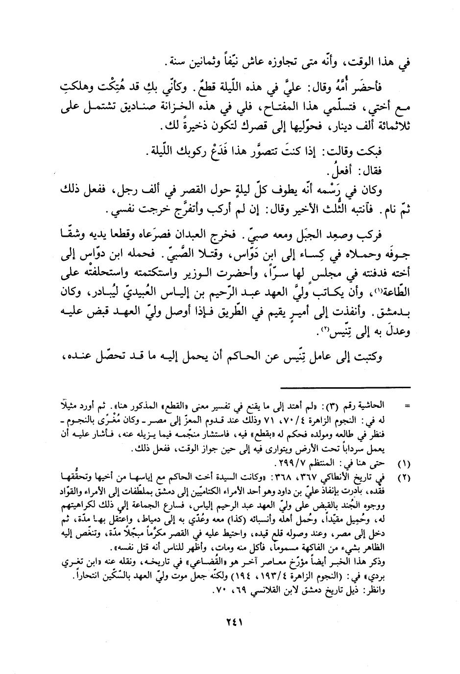 فركب وصعِد الجبَل ومعه صبيّ. فخرج العبدان فصرَعاه وقطعا يديه وشقّا جوفَه وحملاه في كِساء إلى ابن دَوّاس، وقتلا الصَّبيّ. فحمله ابن دَوّاس إلى أخته فدفنته في مجلسٍ لها سرّا، وأحضرت الوزير واستكتمته واستحلفتْه عَلَى الطّاعة [1] ، وأن يكاتب وليَّ العهد عَبْد الرّحيم بْن إلياس العُبيديّ ليُبادر، وكان بدمشق. وأنفذت إلى أميرٍ يقيم في الطّريق فإذا أوصل وليّ العهد قبض عَليْهِ وعدلَ بِهِ إلى تِنّيس [2] .