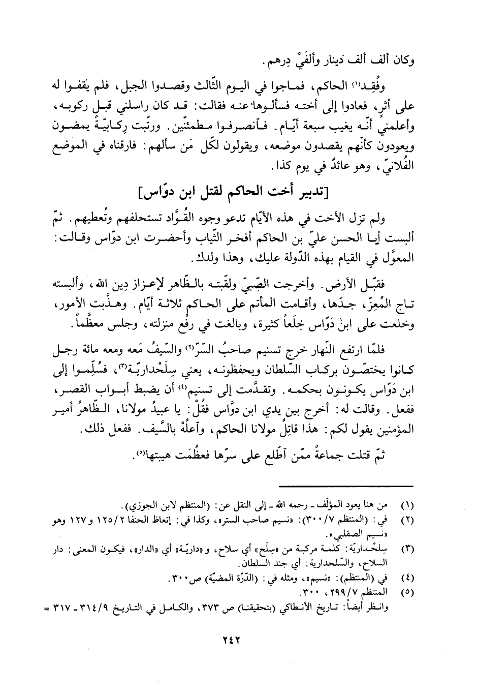فلمّا ارتفع النّهار خرج تسنيم صاحبُ السّرّ [2] والسّيفُ مَعه ومعه مائة رَجُل كانوا يختصّون بركاب السّلطان ويحفظونه، يعنى سِلَحْداريّة [3] ، فسُلّموا إلى ابن دوّاس يكونون بحكمه. وتقدَّمت إلى تسنيم [4] أن يضبط أبواب القصر، ففعل. وقالت لَهُ: أخرج بين يدي ابن دوَّاس فُقلْ: يا عبيدُ مولانا، الظّاهرُ أمير المؤمنين يَقُولُ لكم: هذا قاتِلُ مولانا الحاكم، واعلُهْ بالسَّيف. ففعل ذَلِكَ.