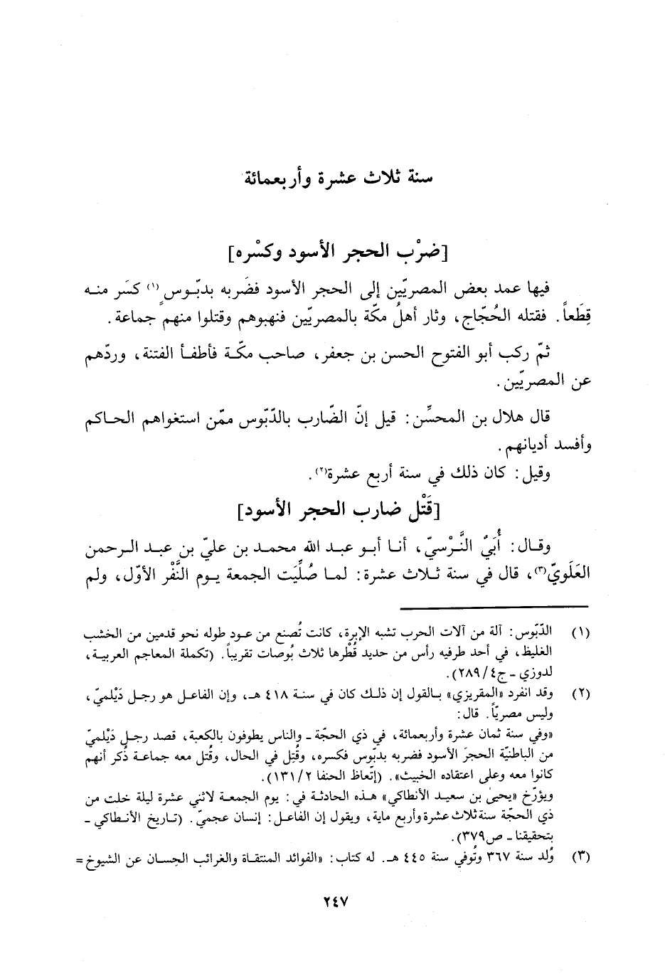 «وفي سنة ثمان عشرة وأربعمائة، في ذي الحجّة- والناس يطوفون بالكعبة، قصد رجل ديلميّ من الباطنيّة الحجر الأسود فضربه بدبّوس فكسره، وقتل في الحال، وقتل معه جماعة ذكر أنهم كانوا معه وعلى اعتقاده الخبيث» . (اتّعاظ الحنفا 2/ 131) .