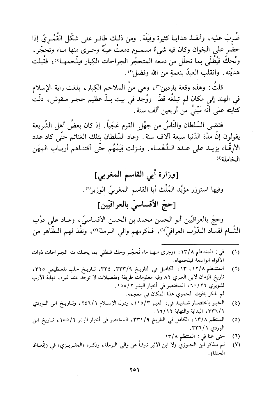 [5] المنتظم 8/ 13، الكامل في التاريخ 9/ 331، المختصر في أخبار البشر 2/ 155، تاريخ ابن الوردي 1/ 336.