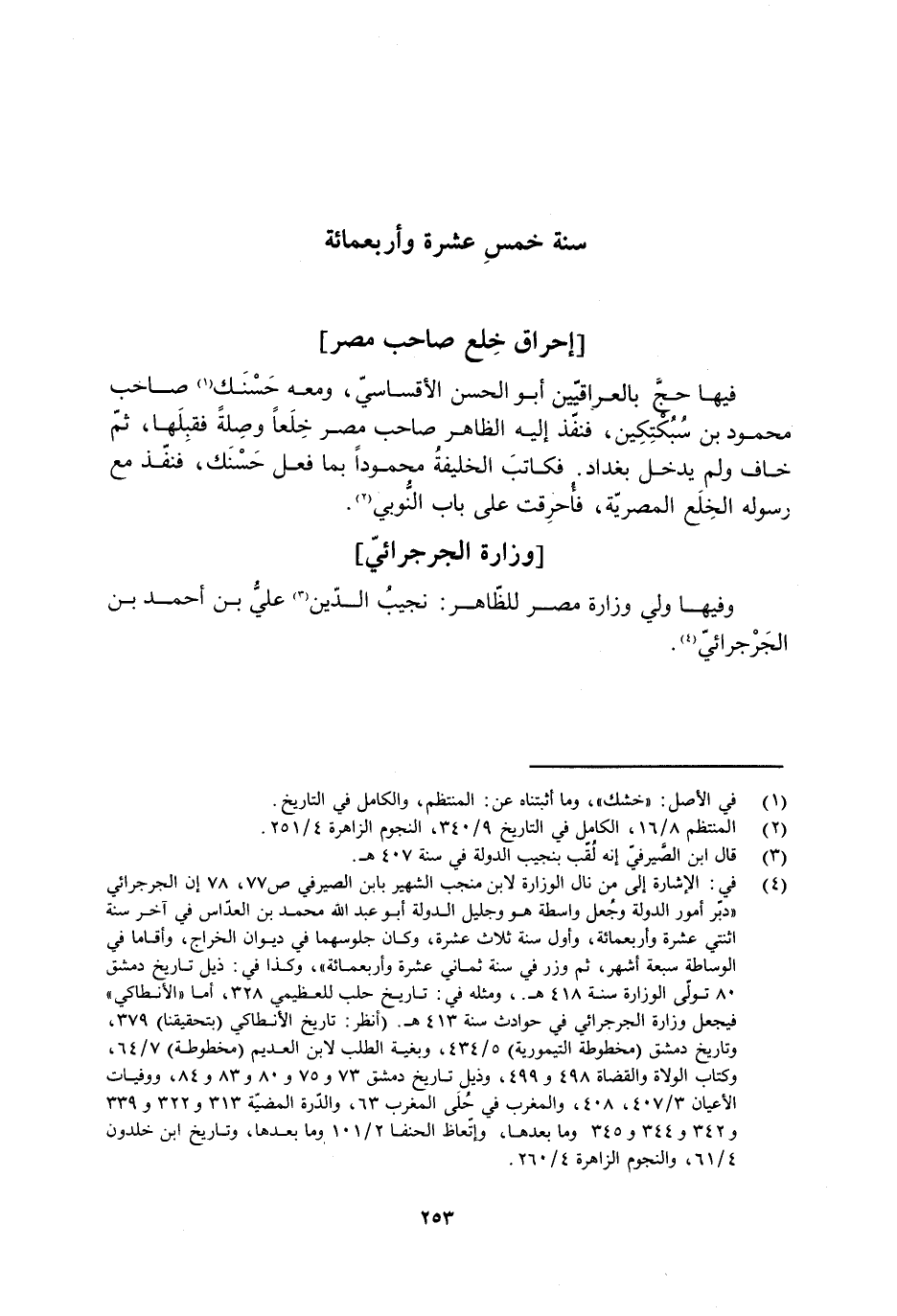 [4] في: الإشارة إلى من نال الوزارة لابن منجب الشهير بابن الصيرفي ص 77، 78 إن الجرجرائي «دبّر أمور الدولة وجعل واسطة هو وجليل الدولة أبو عبد الله محمد بن العدّاس في آخر سنة اثنتي عشرة وأربعمائة، وأول سنة ثلاث عشرة، وكان جلوسهما في ديوان الخراج، وأقاما في الوساطة سبعة أشهر، ثم وزر في سنة ثماني عشرة، وأربعمائة» ، وكذا في: ذيل تاريخ دمشق 80 تولّى الوزارة سنة 418 هـ.، ومثله في: تاريخ حلب للعظيميّ 328، أما «الأنطاكي» فيجعل وزارة الجرجرائي في حوادث سنة 413 هـ. (انظر: تاريخ الأنطاكي (بتحقيقنا) 379، وتاريخ دمشق (مخطوطة التيمورية) 5/ 434، وبغية الطلب لابن العديم (مخطوطة) 7/ 64، وكتاب الولاة والقضاة 498، 499، وذيل تاريخ دمشق 73 و 75 و 80 و 83 و 84، ووفيات الأعيان 3/ 407، 408، والمغرب في حلى المغرب 63، والدّرة المضيّة 313 و 322 و 339 و 342 و 344 و 345 وما بعدها، واتّعاظ الحنفا 2/ 101 وما بعدها، وتاريخ ابن خلدون 4/ 61، والنجوم الزاهرة 4/ 260.