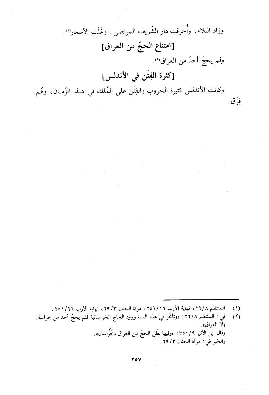 [2] في: المنتظم 8/ 22: «وتأخّر في هذه السنة ورود الحاج الخراسانية فلم يحجّ أحد من خراسان ولا العراق» .