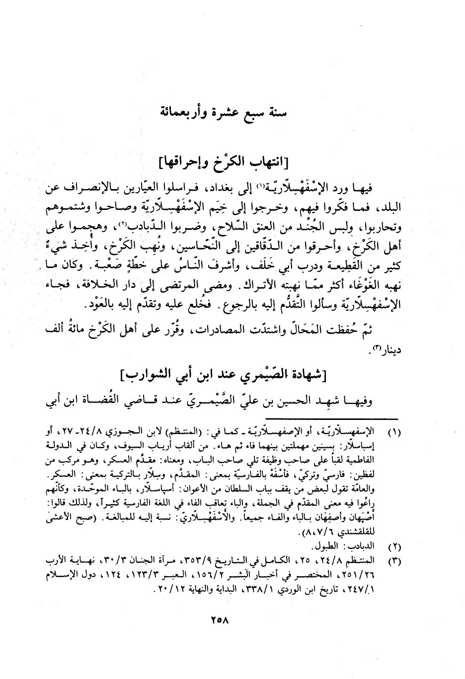 فيها ورد الإسْفَهْسِلاريّة [1] إلى بغداد، فراسلوا العيّارين بالانصراف عَنْ البلد، فما فكّروا فيهم، وخرجوا إلى خِيَم الإسْفَهْسِلاريّة وصاحوا وشتموهم وتحاربوا، ولبس الْجُنْد مِن العنق السّلاح، وضربوا الدّبادب [2] ، وهجموا عَلَى أهل الكَرْخ، وأحرقوا مِن الدّقّاقين إلى النّحّاسين، ونُهب الكَرْخ، وأخِذ شيءٌ كثير مِن القطيعة ودرب أَبِي خَلَف، وأشرف النّاس على خطّةٍ صَعْبة. وكان ما نهبه الغَوْغَاء أكثر ممّا نهبته الأتراك. ومضى المرتضى إلى دار الخلافة، فجاء الإسْفَهْسِلاريّة وسألوا التَّقدُّم إليه بالرجوع. فخلع عَليْهِ وتقدّم إليه بالعَوْد.