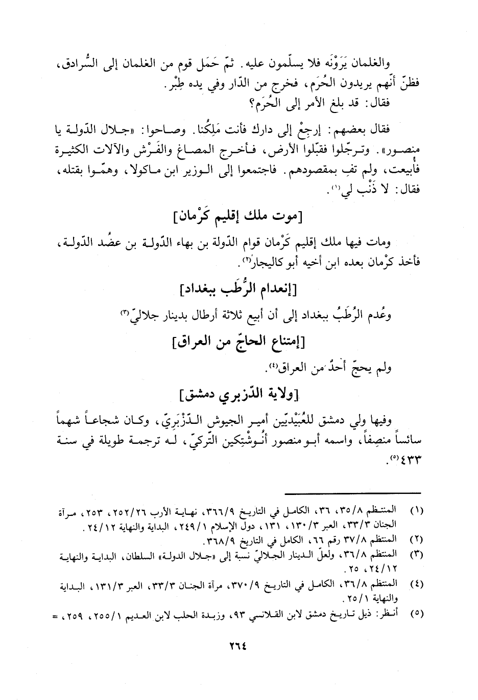 [1] المنتظم 8/ 35، 36، الكامل في التاريخ 9/ 366، نهاية الأرب 26/ 252، 253، مرآة الجنان 3/ 33، العبر 3/ 130، 131، دول الإسلام 1/ 249، البداية والنهاية 12/ 24.