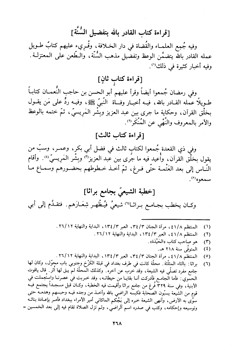 وفي رمضان جُمعوا أيضًا وقرأ عليهم أبو الحسن بْن حاجب النُّعمان كتابًا طويلًا عمله القادر باللَّه، فيه أخبار وفاة النَّبِيّ صَلَّى اللهُ عَلَيْهِ وَسَلَّمَ، وفيه ردٌ عَلَى مِن يَقُولُ بخلْق القرآن، وحكاية ما جرى بين عَبْد العزيز وبِشْر المَرِيسيّ، ثمّ ختمه بالوعظ والأمر بالمعروف والنَّهي عَنْ المنُكْر [2] .