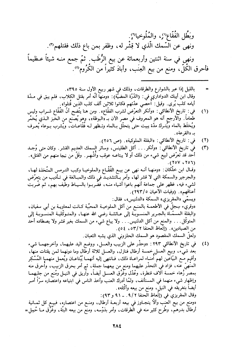 [3] في تاريخ الأنطاكي: «وأنكر ... أكل الطلينس، وسائر السمك العديم القشر. وكان متى وجد أحد قد تعرّض لبيع شيء من ذلك أو لا يبتاعه عوقب وأشهر. وقلّ من نجا منهم من القتل» .