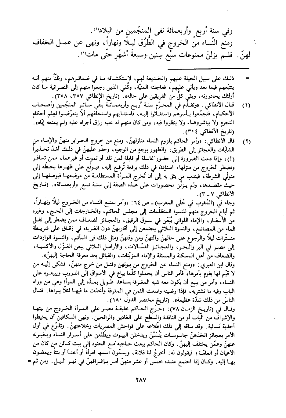 [2] قال الأنطاكي: «وأمر الحاكم بلزوم النساء منازلهنّ، ومنع من خروج الحرائر منهنّ والإماء من الشابّات والعجائز إلى الطريق، والظهور بوجه من الوجوه، وحذّر عليهنّ في ذلك أشدّ تحذيرا (!) ، وإذا دعت الضرورة إلى حضور غاسلة أو قابلة لمن تلد أو تموت أو غيرهما، ممن تسافر وتضطر الخروج من منزلها، استؤذن في ذلك برقعة ترفع إليه، فيوقّع على ظهرها بخطّه إلى متولّي الشرطة، فيندب من يثق به إلى أن تخرج المرأة المستطلعة من موضعها فيوصلها إلى حيث مقصدها، ولم يزلن محصورات على هذه الصفة إلى سنة تسع وأربعمائة» . (تاريخ الأنطاكي 7- 3) .