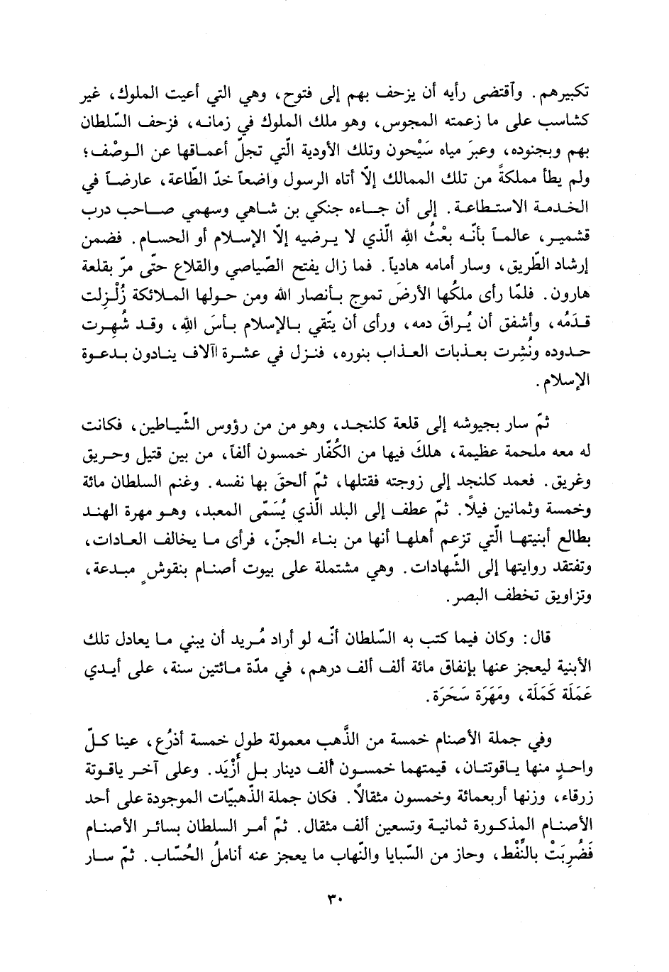 وفي جملة الأصنام خمسة من الذَّهب معمولة طول خمسة أذُرع، عينا كلّ واحدٍ منها ياقوتتان، قيمتهما خمسون ألف دينار بل أزْيَد. وعلى آخر ياقوتة زرقاء، وزنها أربعمائة وخمسون مثقالًا. فكان جملة الذّهبيّات الموجودة عَلَى أحد الأصنام المذكورة ثمانية وتسعين ألف مثقال. ثم أمر السلطان بسائر الأصنام فَضُرِبَت بالنِّفْط، وحاز من السّبايا والنّهاب ما يعجز عَنْهُ أناملُ الحُسّاب. ثمّ سار