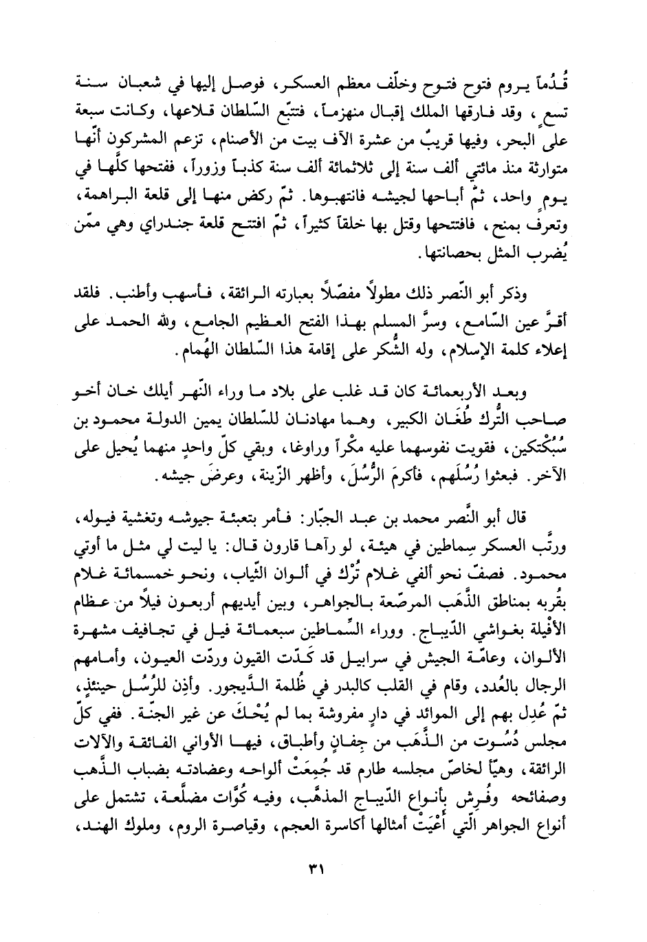 وذكر أبو النّصر ذَلِكَ مطولًا مفصّلًا بعبارته الرائقة، فأسهب وأطنب. فلقد أقَّر عين السّامع، وسرَّ المسلم بهذا الفتح العظيم الجامع، وللَّه الحمد عَلَى إعلاء كلمة الإسلام، وله الشُّكر عَلَى إقامة هذا السّلطان الهمام.