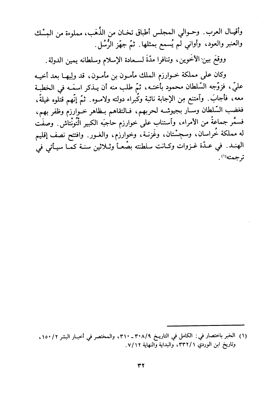 وكان عَلَى مملكة خوارزم الملك مأمون بْن مأمون، قد وليها بعد أخيه عليّ، فزوّجه السّلطان محمود بأخته، ثمّ طلب منه أن يذكر اسمه في الخطبة معه، فأجابَ. وامتنع من الإجابة نائبه وكُبراء دولته ولاموه. ثمّ إنّهم قتلوه غيلةً، فغضب السّلطان وسار بجيوشه لحربهم، فالتقاهم بظاهر خوارزم وظفر بهم، فسمّر جماعة من الأمراء، واستناب على خوارزم حاجبه الكبير التونتاش. وصفَت لَهُ مملكة خُراسان، وسجِسْتان، وغَزنة، وخوارزم، والغور. وافتتح نصف إقليم الهند. في عدّة غزوات وكانت سلطنته بضعا وثلاثين سنة كما سيأتي في ترجمته [1] .