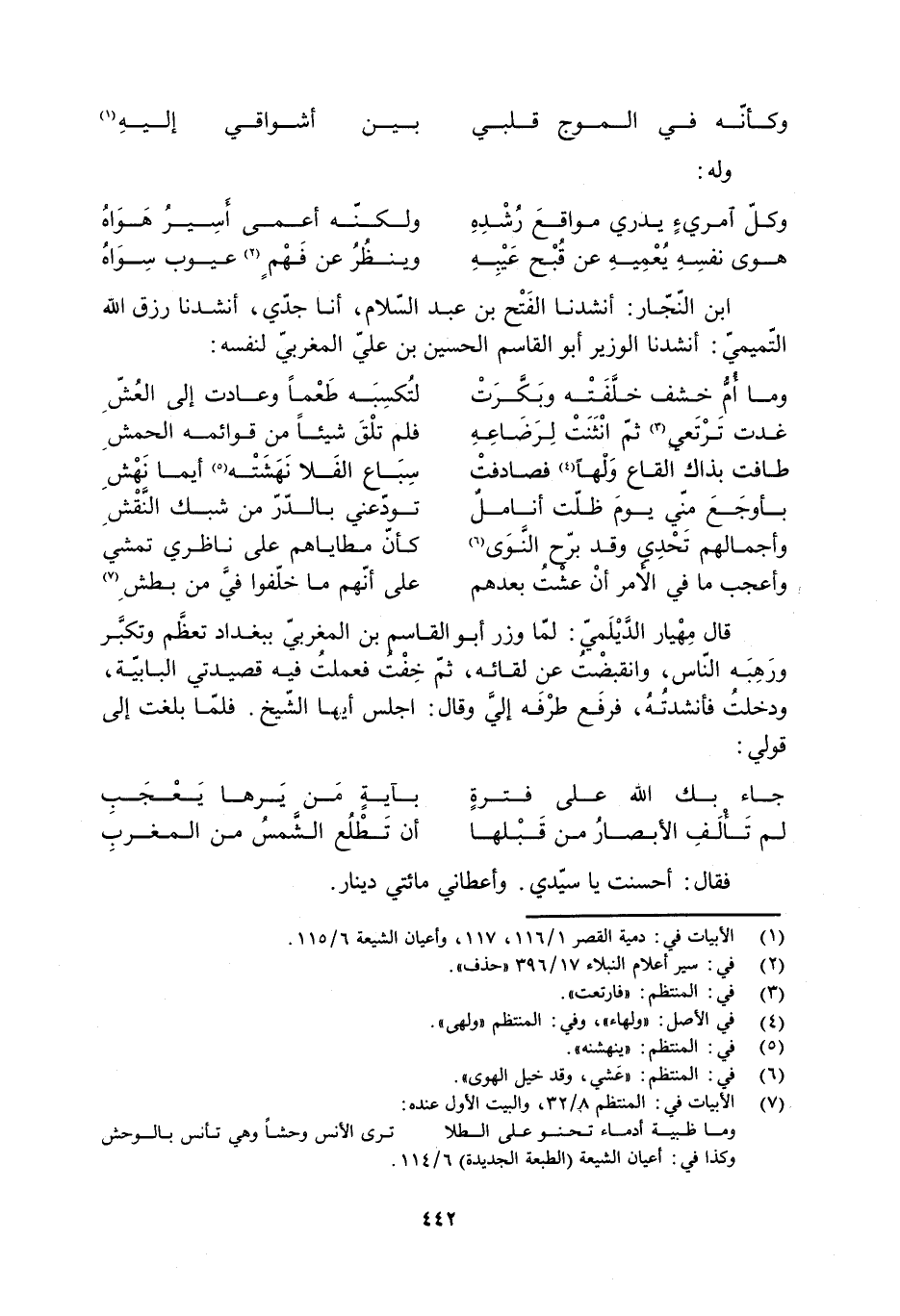 [1] الأبيات في: دمية القصر 1/ 116، 117، وأعيان الشيعة 6/ 115.