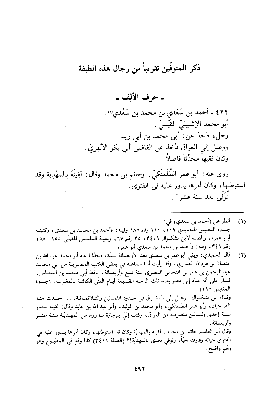 [2] قال الحميدي: وبقي أبو عمر بن سعدي بعد الأربعمائة بمدّة، فحدّثنا عنه أبو محمد عبد الله بن عثمان بن مروان العمري، وقد رأيت أنا سماعه في بعض الكتب المصرية من أبي محمد عبد الرحمن بن عمر بن النحاس المصري سنة تسع وأربعمائة، بخط أبي محمد بن النحاس، فدلّ على أنه عاد إلى مصر بعد تلك الرحلة القديمة أيام الفتن الكائنة بالمغرب. (جذوة المقتبس 110) .