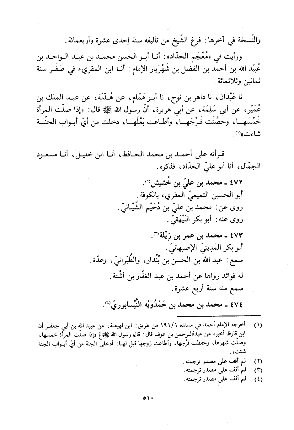قَرَأْتُهُ عَلَى أَحْمَدَ بْنِ مُحَمَّدٍ الْحَافِظِ، أنا ابن خَلِيلٍ، أنا مَسْعُودٌ الْجَمَّالُ، أنا أَبُو عَلِيٍّ الْحَدَّادِ، فَذَكَرَهُ. 472- محمد بْن عليّ بن خشيش [2] .