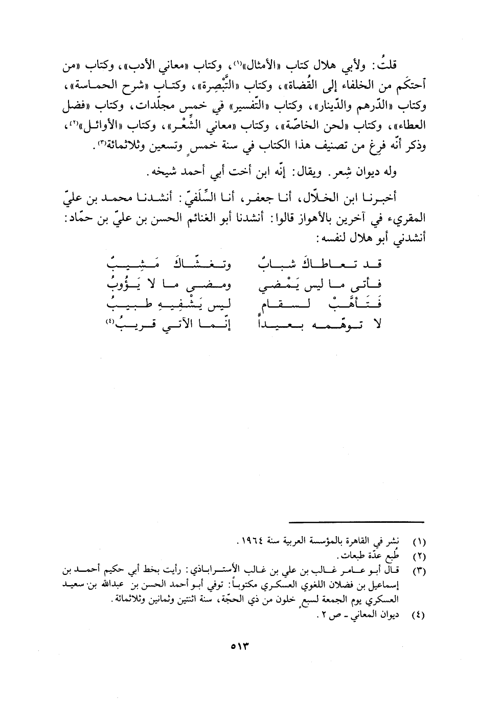 قلتُ: ولأبي هلال كتاب «الأمثال» [1] ، وكتاب «معاني الأدب» ، وكتاب «مِن احتكم مِن الخلفاء إلى القُضاة» ، وكتاب «التبْصِرة» ، وكتاب «شرح الحماسة» ، وكتاب «الدّرهم والدّينار» ، وكتاب «التّفسير» في خمس مجلّدات، وكتاب «فضل العطاء» ، وكتاب «لحن الخاصّة» ، وكتاب «معاني الشّعر» ، وكتاب «الأوائل» [2] ، وذكر أنّه فرغ مِن تصنيف هذا الكتاب في سنة خمس وتسعين وثلاثمائة [3] .