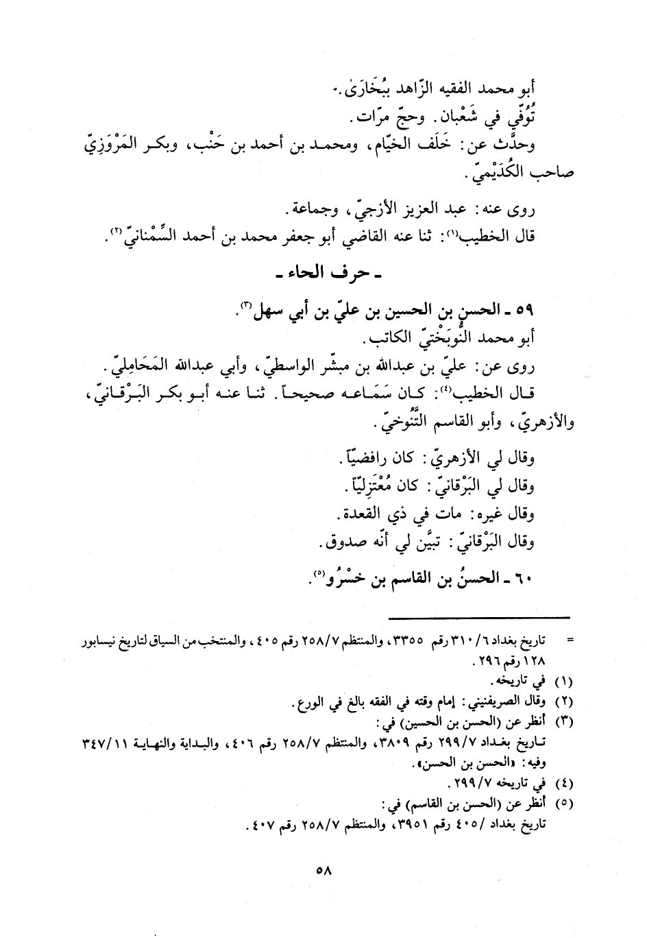 [ () ] تاريخ بغداد 6/ 310 رقم 3355، والمنتظم 7/ 258 رقم 405، والمنتخب من السياق لتاريخ نيسابور 128 رقم 296.