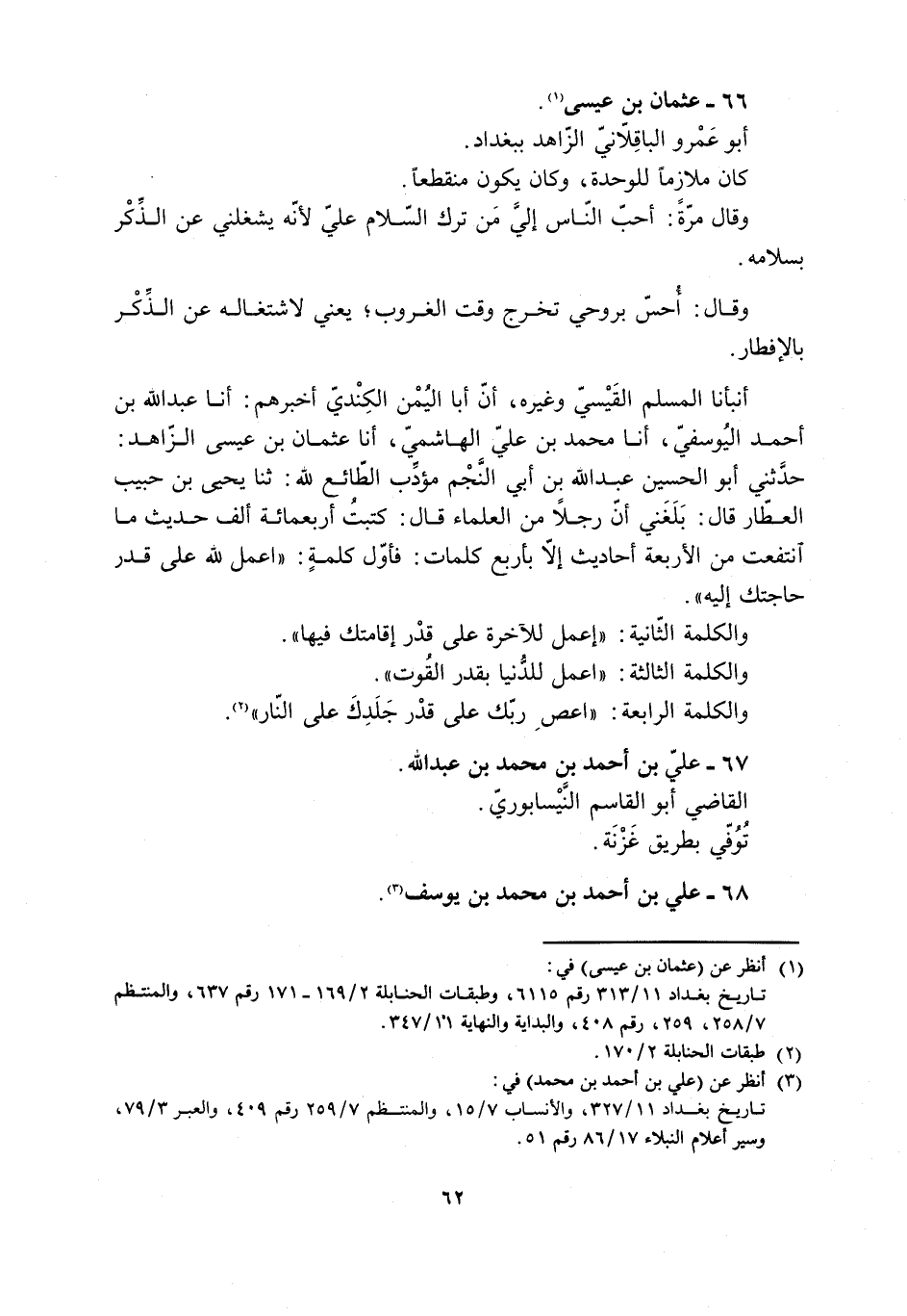 حدثني أبو الحسين عَبْد الله بْن أَبِي النَّجْم مؤدب الطّائع للَّه: ثنا يحيى بْن حبيب العطّار قَالَ: بَلَغَني أنّ رجلًا من العلماء قَالَ: كتبت أربعمائة ألف حديث ما أنتفعت من الأربعة أحاديث إلا بأربع كلمات: فأوّل كلمة: «أعمل للَّه عَلَى قدر حاجتك إِليْهِ» .