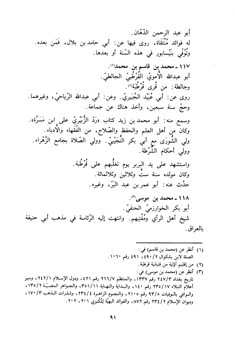 تاريخ بغداد 3/ 247 رقم 1337، والمنتظم 7/ 266 رقم 421، ودول الإسلام 1/ 242، وسير أعلام النبلاء 17/ 235 رقم 140، والبداية والنهاية 11/ 351، والجواهر المضيّة 2/ 135، والوافي بالوفيات 5/ 93 رقم 2105، والنجوم الزاهرة 4/ 234، وشذرات الذهب 3/ 170، وديوان الإسلام 2/ 234 رقم 872، والفوائد البهيّة للّكنوي 201، 202.