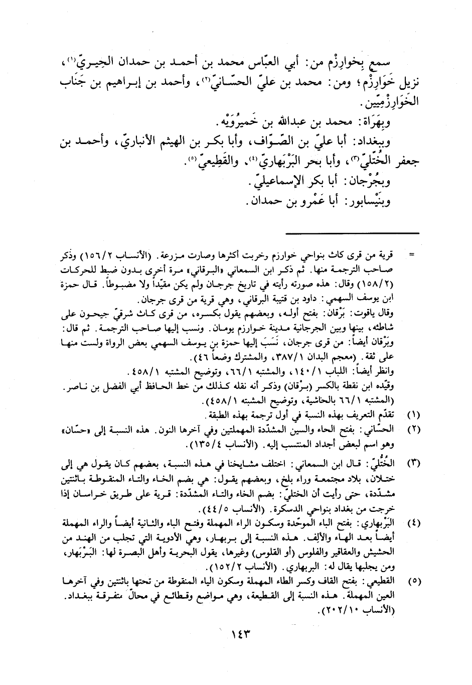 [5] القطيعي: بفتح القاف وكسر الطاء المهملة وسكون الياء المنقوطة من تحتها باثنتين وفي آخرها العين المهملة. هذه النسبة إلى القطيعة، وهي مواضع وقطائع في محالّ متفرقة ببغداد.