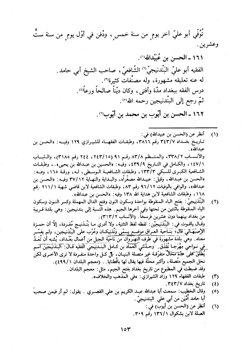 [2] البندنيجيّ: بفتح الباء المنقوطة بواحدة وسكون النون وفتح الدال المهملة وكسر النون وسكون الياء المنقوطة باثنتين من تحتها وفي آخرها الجيم. هذه النسبة إلى بندنيجين: وهي بلدة قريبة من بغداد بينهما دون عشرين فرسخا. (الأنساب 2/ 313) .
