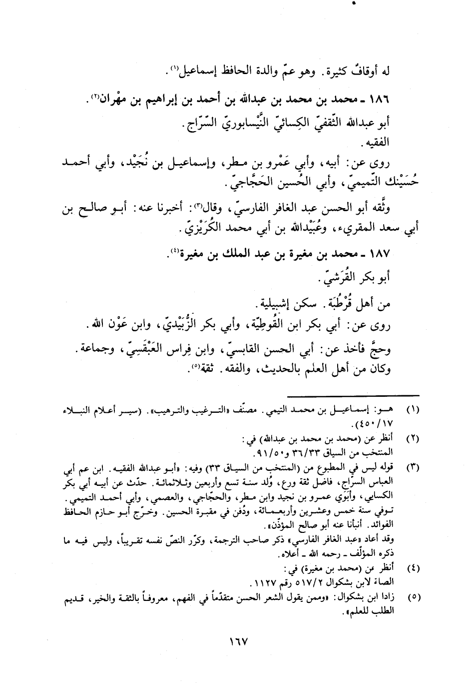 [3] قوله ليس في المطبوع من (المنتخب من السياق 33) وفيه: «أبو عبد الله الفقيه. ابن عم أبي العباس السّراج، فاضل ثقة ورع، ولد سنة تسع وأربعين وثلاثمائة. حدّث عن أبيه أبي بكر الكسائي، وأبوي عمرو بن نجيد وابن مطر، والحجّاجي، والعصمي، وأبي أحمد التميمي.