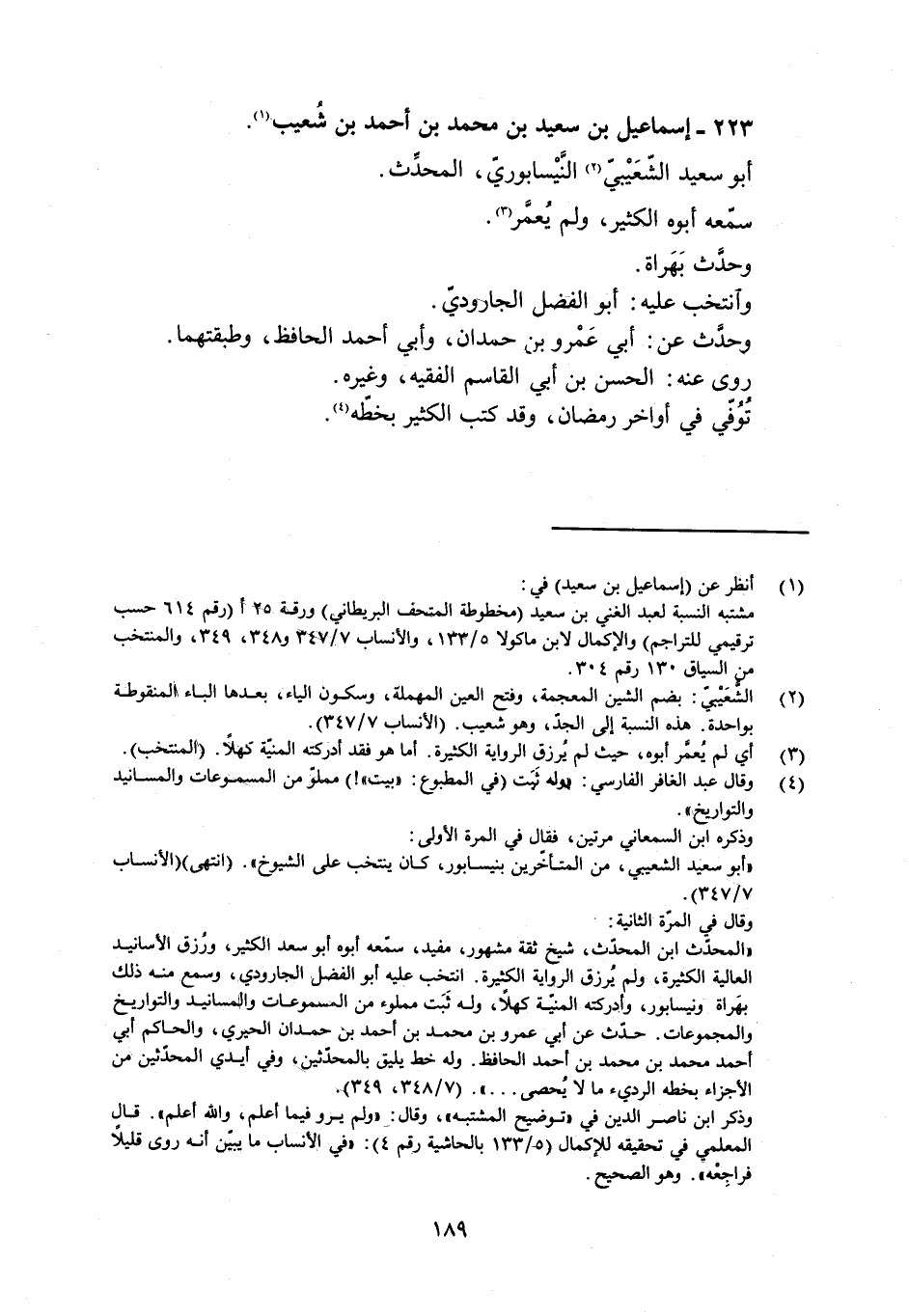 [2] الشّعيبيّ: بضم الشين المعجمة، وفتح العين المهملة، وسكون الياء، بعدها الباء المنقوطة بواحدة. هذه النسبة إلى الجدّ، وهو شعيب. (الأنساب 7/ 347) .