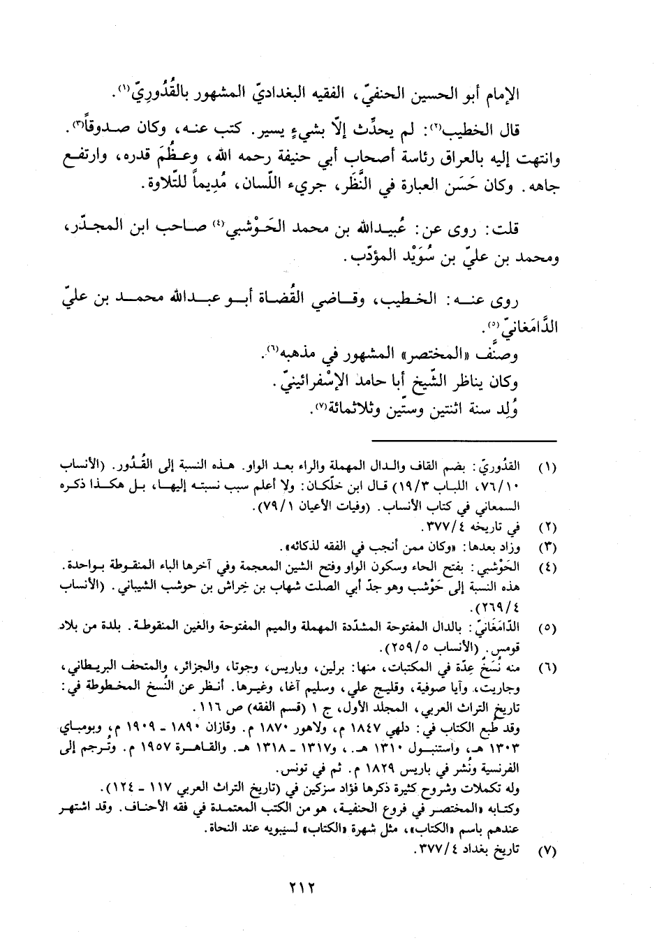 [1] القدوريّ: بضم القاف والدال المهملة والراء بعد الواو. هذه النسبة إلى القدور. (الأنساب 10/ 76، اللباب 3/ 19) قال ابن خلّكان: ولا أعلم سبب نسبته إليها، بل هكذا ذكره السمعاني في كتاب الأنساب. (وفيات الأعيان 1/ 79) .