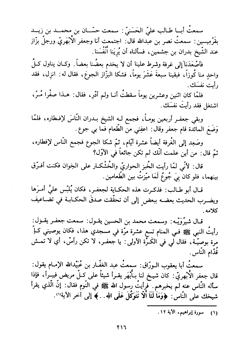 سمعتُ أبا طالب عليّ الحَسَنيّ: سمعت حسّان بن محمد بن زيد بقَرمِيسين: سمعتُ نصر بن عبد الله قال: اجتمعت أنا وجعفر الأبهريّ ورجل بزّاز عند الشّيخ بدران بن جشمين، فسألناه أن يُرِينَا أَنْفُسَنَا.