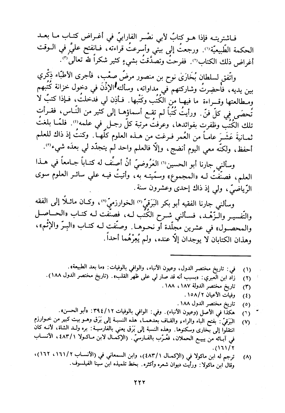 فاشتريته فإذا هو كتابٌ لأبي نصر الفارابيّ في أغراض كتاب ما بعد الحكمة الطّبيعيّة [1] . ورجعتُ إلى بيتي وأسرعتُ قراءته، فانفتح عليَّ في الوقت أغراض ذلك الكتاب [2] . ففرحتُ وتصدَّقتُ بشيءٍ كثير شكرًا للَّه تَعَالَى [3] .