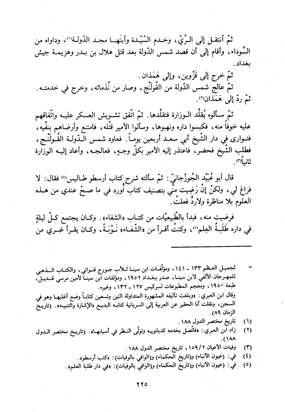 فرضيت منه، فبدأ بالطّبيعيّات من كتاب «الشّفاء» . وكان يجتمع كلّ ليلةٍ في داره طَلَبَةُ العِلمِ [5] ، وكنتُ أقرأ من «الشّفاء» نوبة، وكان يقرأ غبري من
