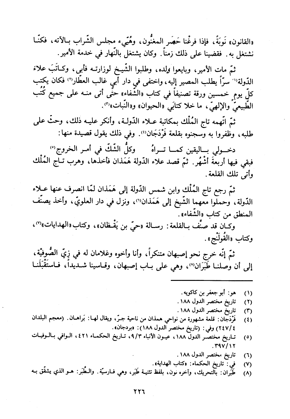ثمّ مات الأمير، وبايعوا ولده، وطلبوا الشّيخ لوزارته فأبى، وكَاتَبَ علاءَ الدّولة [1] سرًّا يطلب المصير إليه، واختفى في دار أبي غالب العطّار [2] فكان يكتب كلّ يومٍ خمسين ورقة تصنيفا في كتاب «الشّفاء» حتّى أتى منه على جميع كُتب الطّبيعيّ والإلهيّ، ما خلا كتابيّ «الحيوان» و «النّبات» [3] .
