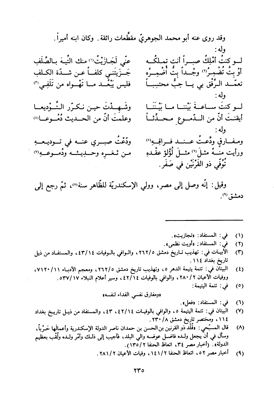[7] البيتان في: تتمة اليتيمة 5، والوافي بالوفيات 14/ 42، 43، والمستفاد من ذيل تاريخ بغداد 114، ومختصر تاريخ دمشق 8/ 230.