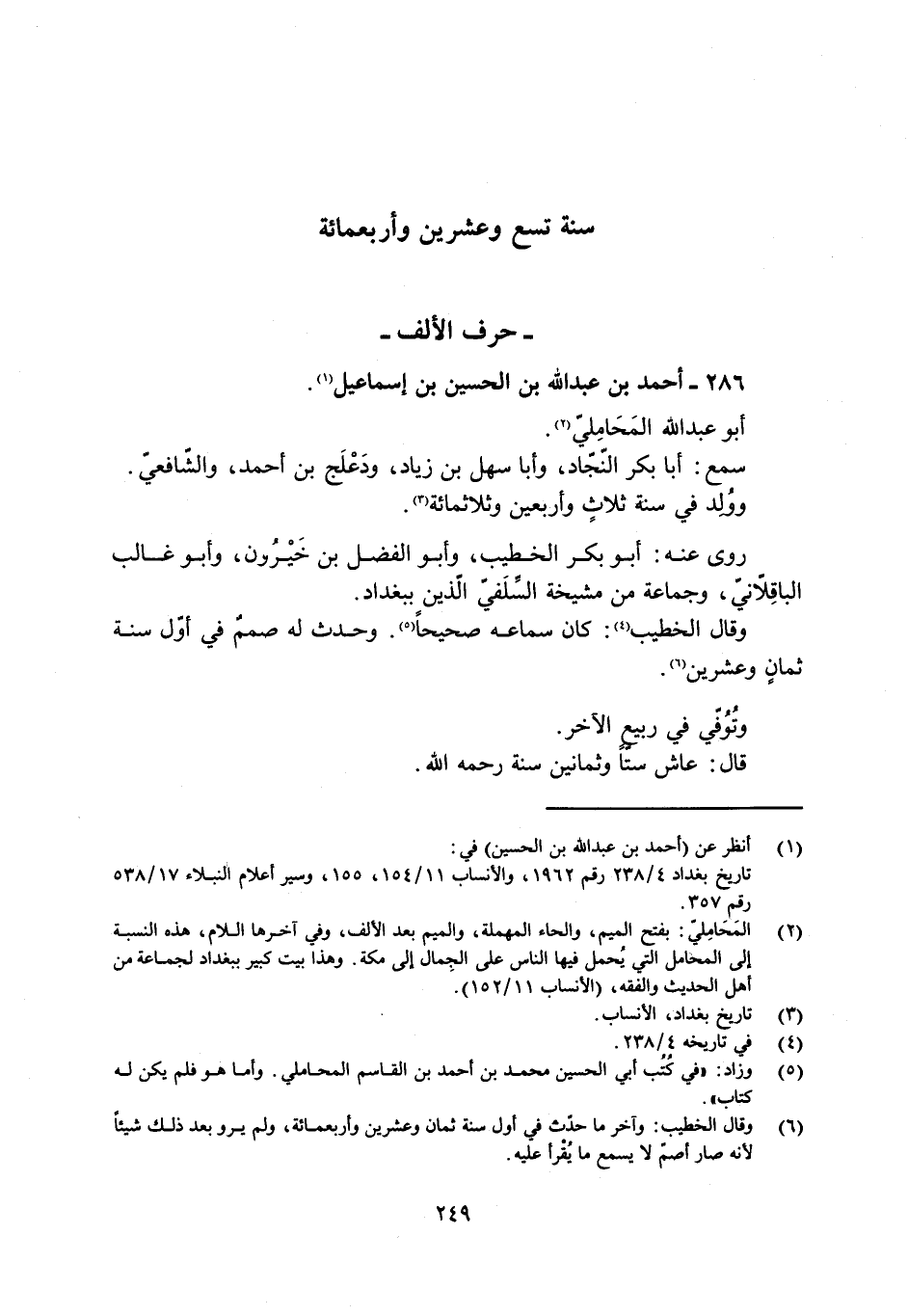 [5] وزاد: «في كتب أبي الحسين محمد بن أحمد بن القاسم المحاملي. وأما هو فلم يكن له كتاب» .