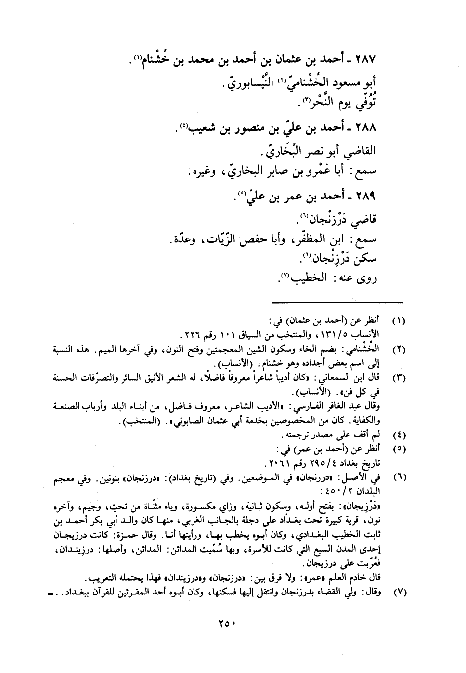 [2] الخشنامي: بضم الخاء وسكون الشين المعجمتين وفتح النون، وفي آخرها الميم. هذه النسبة إلى اسم بعض أجداده وهو خشنام. (الأنساب) .