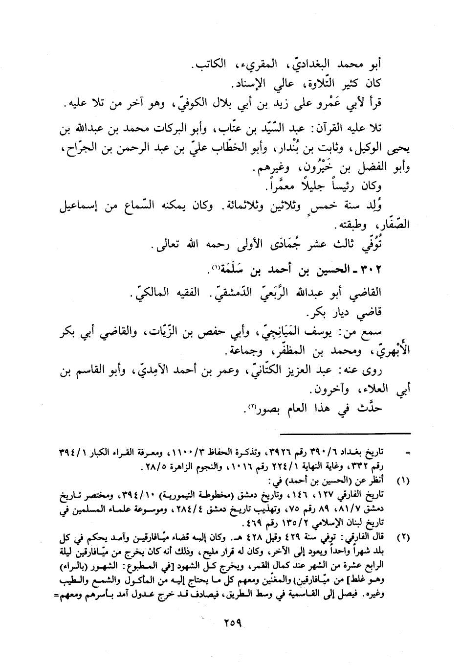 [ () ] تاريخ بغداد 6/ 390 رقم 3926، وتذكرة الحفاظ 3/ 1100، ومعرفة القراء الكبار 1/ 394 رقم 332، وغاية النهاية 1/ 224 رقم 1016، والنجوم الزاهرة 5/ 28.
