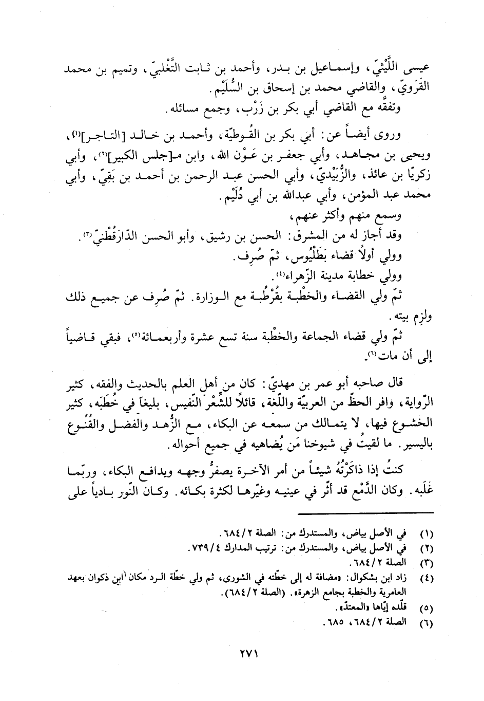 [4] زاد ابن بشكوال: «مضافة له إلى خطّته في الشورى، ثم ولي خطّة الرد مكان ابن ذكوان بعهد العامرية والخطبة بجامع الزهرة» . (الصلة 2/ 684) .