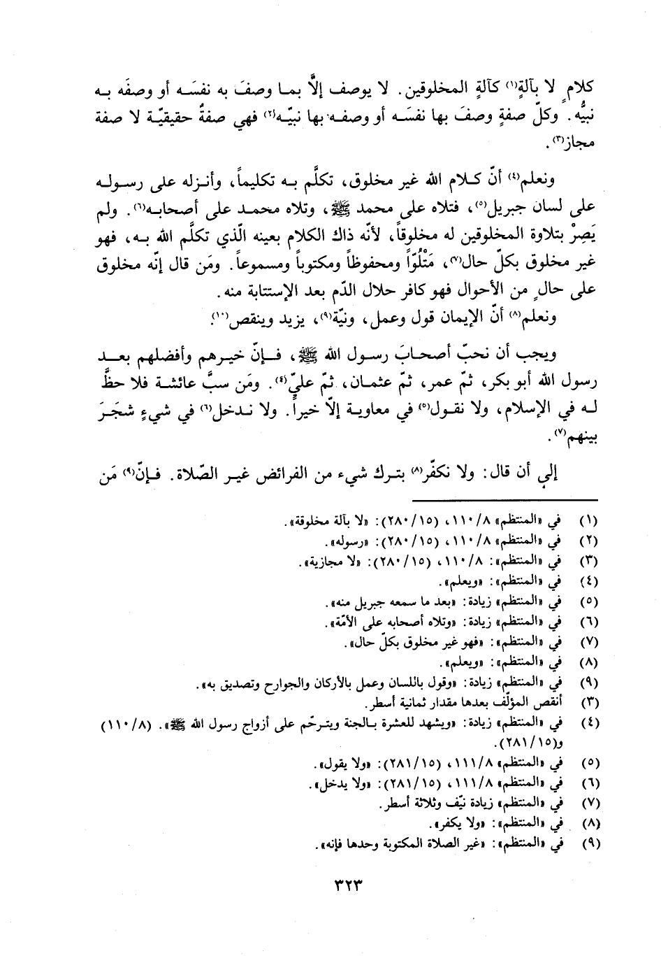 ونعلم [4] أنّ كلام الله غير مخلوق، تكلّم به تكليمًا، وأنزله على رسوله على لسان جبريل [5] ، فتلاه على محمد صلى الله عليه وسلم، وتلاه محمد على أصحابه [6] . ولم يَصِرْ بتلاوة المخلوقين له مخلوقًا، لأنّه ذاك الكلام بعينه الّذي تكلَّم الله به، فهو غير مخلوق بكلّ حال [7] ، مَتْلُوًّا ومحفوظًا ومكتوبًا ومسموعًا. ومَن قال إنّه مخلوق على حال من الأحوال فهو كافر حلال الدّم بعد الاستتابة منه.