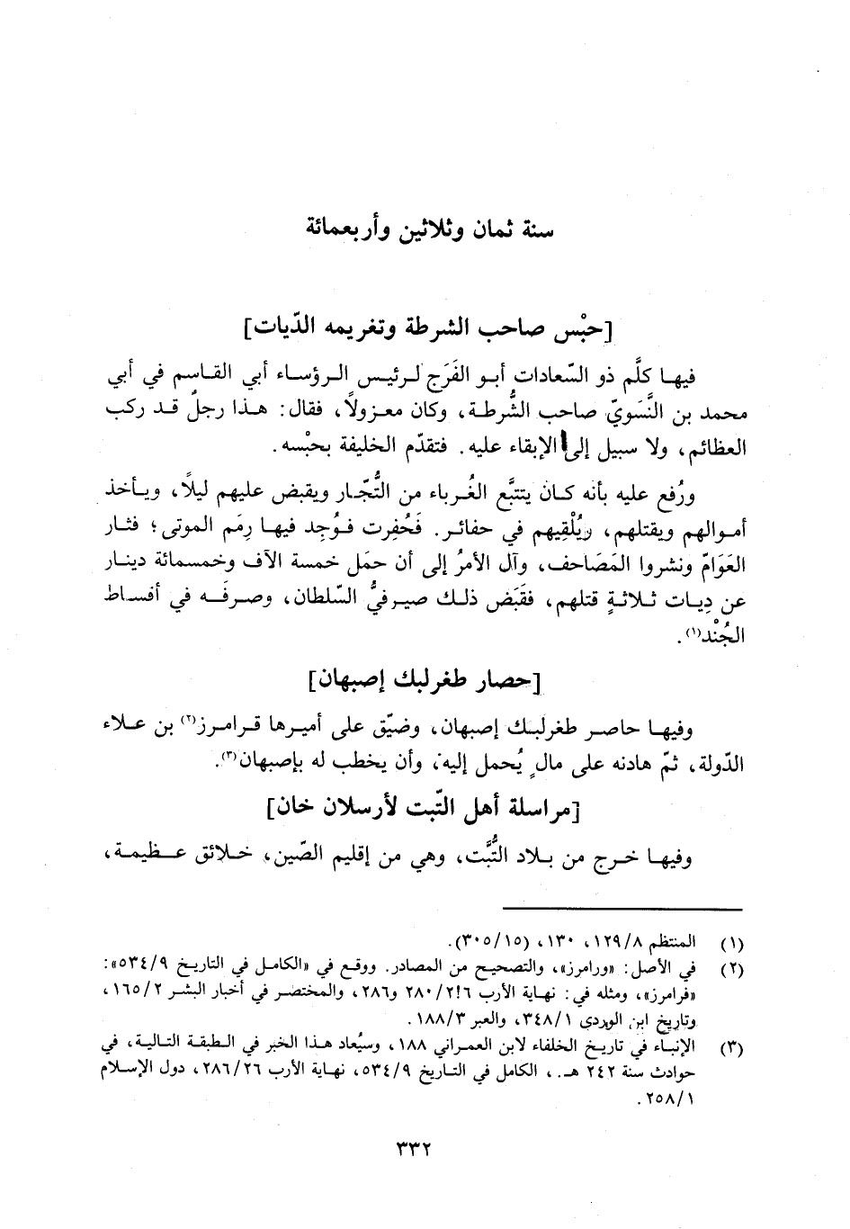 وفيها حاصر طغرلبك إصبهان، وضيّق على أميرها قرامرز [2] ، بن علاء الدّولة، ثمّ هادنه على مالٍ يُحمل إليه، وأن يُخطب له بأصبهان [3] .