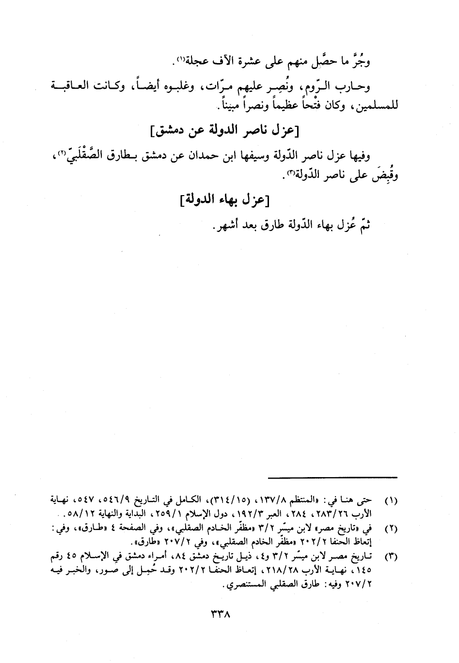 وفيها عزل ناصر الدّولة وسيفها ابن حمدان عن دمشق بطارق الصَّقْلَبيّ [2] ، وقُبِضَ على ناصر الدّولة [3] .