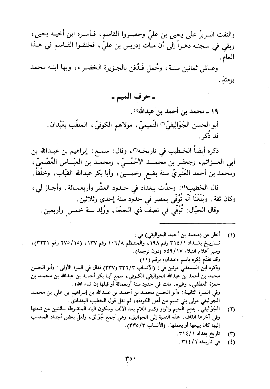 وفي المرة الثانية: «أبو الحسن محمد بن أَحْمَد بْن عَبْد الله بْن إِبْرَاهِيم بْن علي بن محمد الجواليقيّ مولى بني تميم من أهل الكوفة» ، ثم نقل قول الخطيب البغدادي.