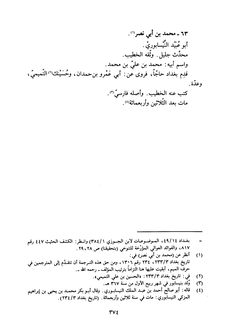 [4] قاله: أبو صالح أحمد بن عبد الملك النيسابورىّ. وقال أبو بكر محمد بن يحيى بن إبراهيم المزكي النيسابورىّ: مات في سنة ثلاثين وأربعمائة. (تاريخ بغداد 3/ 234) .