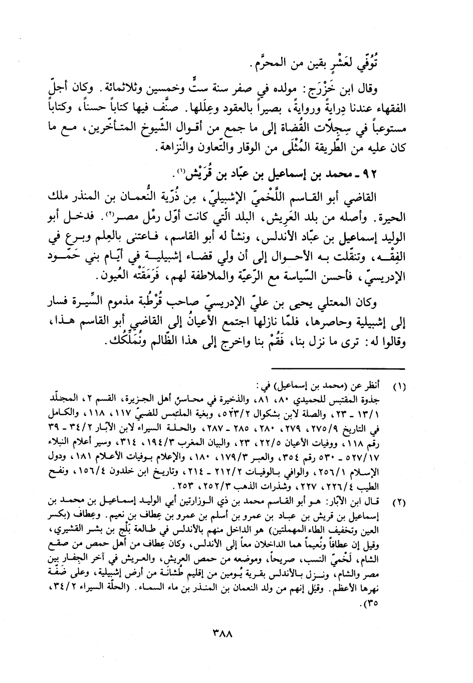 [2] قال ابن الأبّار: هو أبو القاسم محمد بن ذي الوزارتين أبي الوليد إسماعيل بن محمد بن إسماعيل بن قريش بن عباد بن عمرو بن أسلم بن عمرو بن عطاف بن نعيم. وعطاف (بكسر العين وتخفيف الطاء المهملتين) هو الداخل منهم بالأندلس في طالعة بلج بن بشر القشيري، وقيل إن عطافا ونعيما هما الداخلان معا إلى الأندلس، وكان عطاف من أهل حمص من صقع الشام، لخميّ النسب، صريحا، وموضعه من حمص العريش، والعريش في آخر الجفار بين مصر والشام، ونزل بالأندلس بقرية يومين من إقليم طشانة من أرض إشبيلية، وعلى ضفّة نهرها الأعظم. وقيل إنهم من ولد النعمان بن المنذر بن ماء السماء. (الحلّة السيراء 2/ 34، 35) .