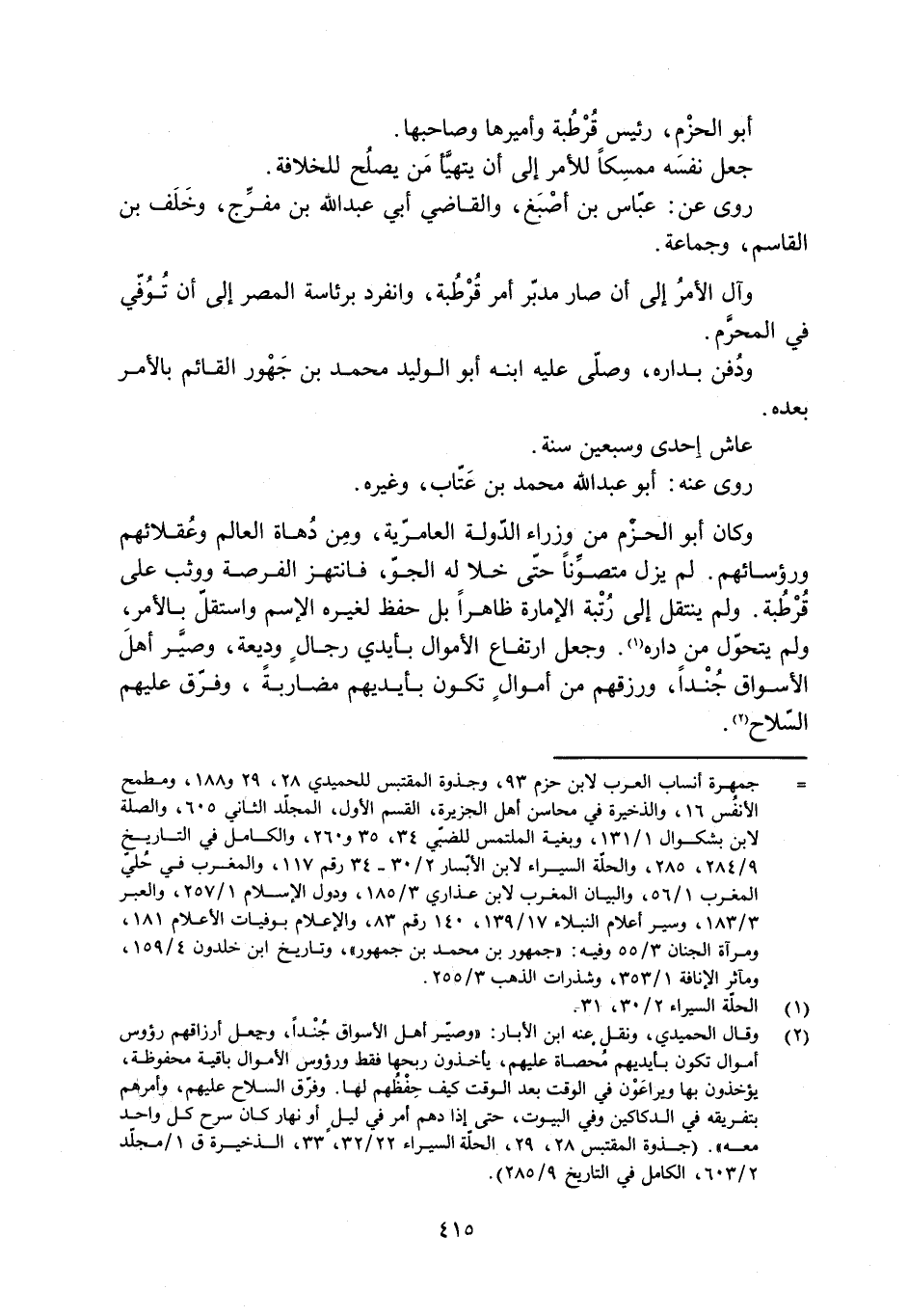 [ () ] جمهرة أنساب العرب لابن حزم 93، وجذوة المقتبس للحميدي 28، 29 و 188، ومطمح الأنفس 16، والذخيرة في محاسن أهل الجزيرة، القسم الأول، المجلّد الثاني 605، والصلة لابن بشكوال 1/ 131، وبغية الملتمس للضبيّ 34، 35 و 260، والكامل في التاريخ 9/ 284، 285، والحلّة السيراء لابن الأبّار 2/ 30- 34 رقم 117، والمغرب في حليّ المغرب 1/ 56، والبيان المغرب لابن عذاري 3/ 185، ودول الإسلام 1/ 257، والعبر 3/ 183، وسير أعلام النبلاء 17/ 139، 140 رقم 83، والإعلام بوفيات الأعلام 181، ومرآة الجنان 3/ 55 وفيه: «جمهور بن محمد بن جمهور» ، وتاريخ ابن خلدون 4/ 159، ومآثر الإنافة 1/ 353، وشذرات الذهب 3/ 255.