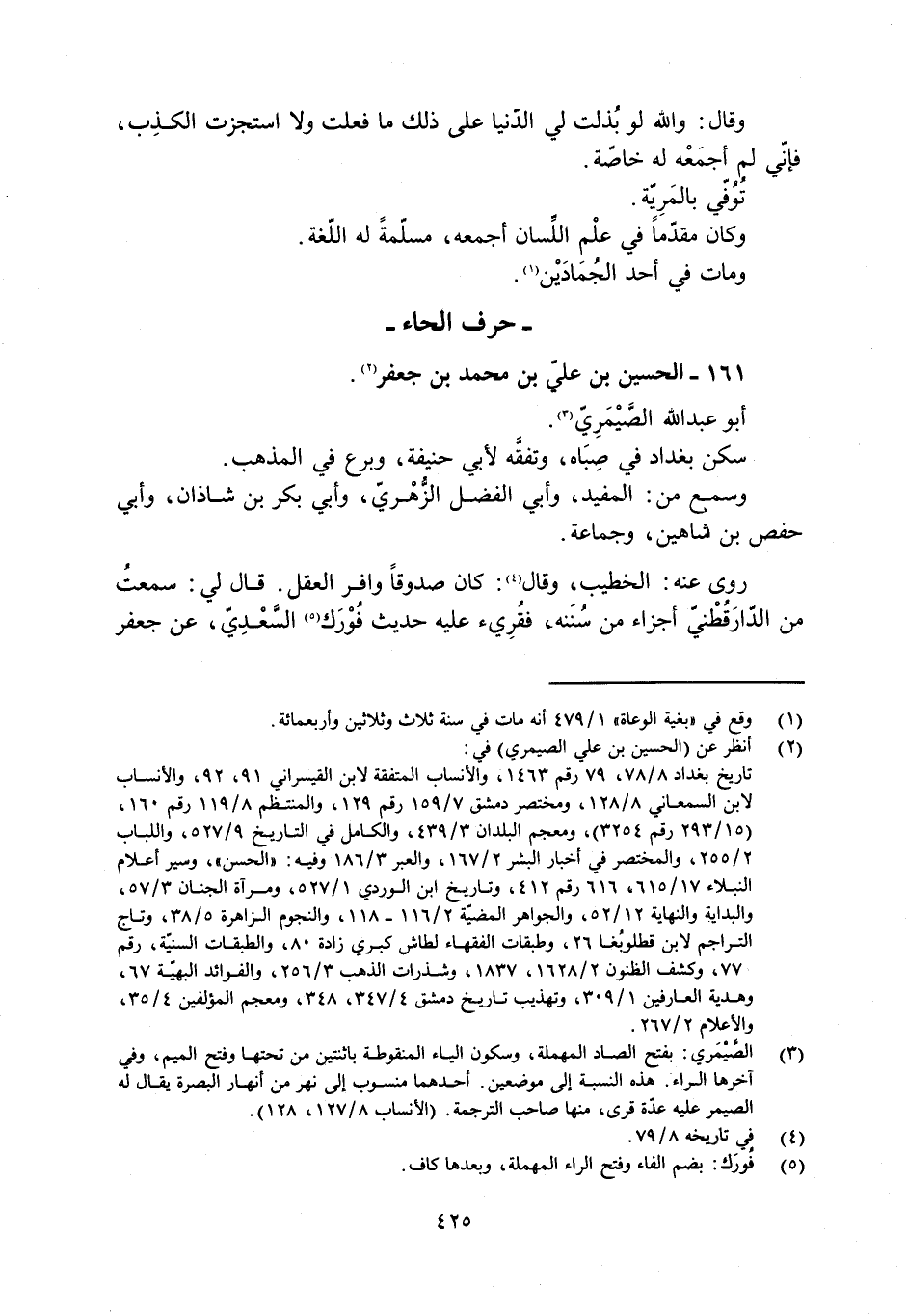 [3] الصّيمري: بفتح الصاد المهملة، وسكون الياء المنقوطة باثنتين من تحتها وفتح الميم، وفي آخرها الراء هذه النسبة إلى موضعين. أحدهما منسوب إلى نهر من أنهار البصرة يقال له الصيمر عليه عدّة قرى، منها صاحب الترجمة. (الأنساب 8/ 127، 128) .